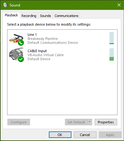 You should see something that looks like this Where line 1 would be your Headset. Cable Input is the virtual audio cable you just installed.